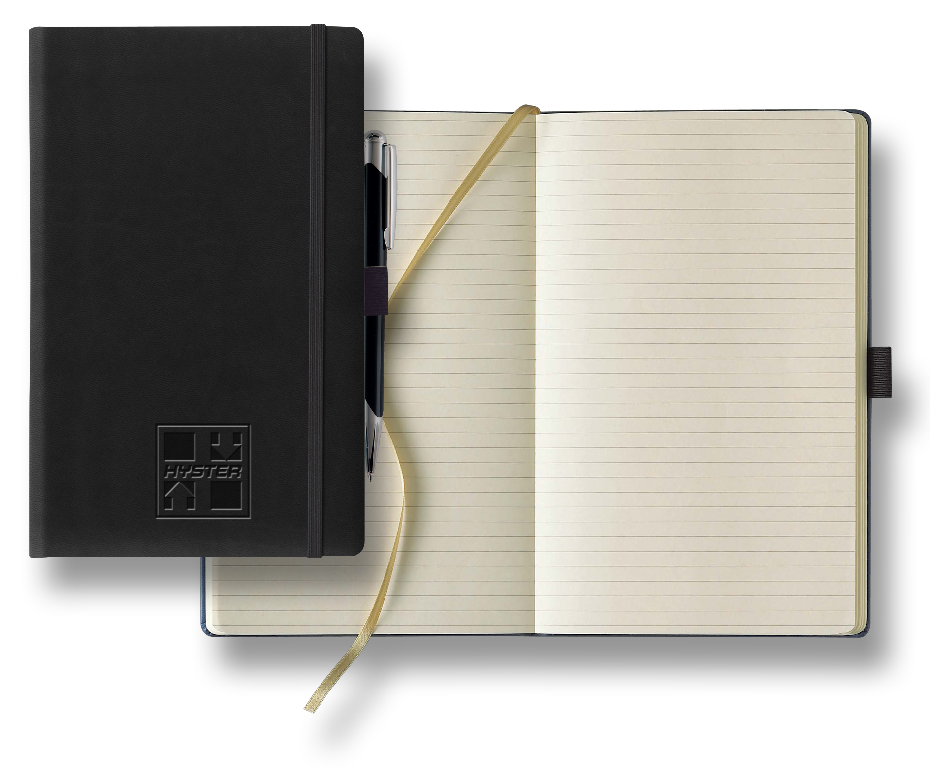 sku: HYS299This black medium journal book includes an elastic closure, lined pages in gray print on 240 pages of FSC certified Ivory paper. It also includes a back expandable pocket, pen loop, and a gold ribbon marker. The cover has a smooth soft texture that looks and feels almost like real leather. Size 5 3/4 x 8 1/5 inches. Includes black ballpoint pen. Hyster logo debossed on bottom centered.